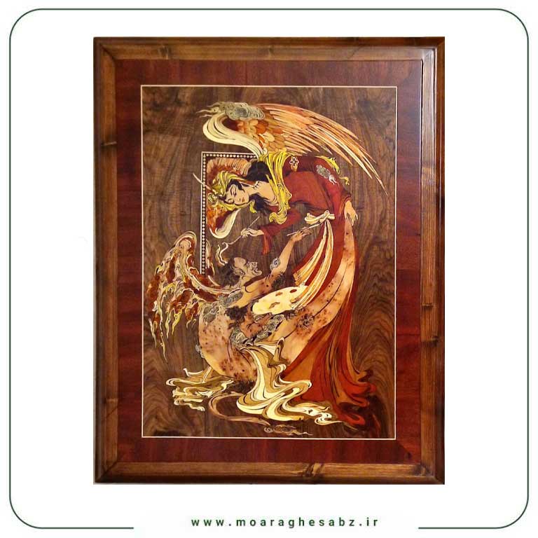 تابلوی معرق «فرشته و شیطان (خیر و شر)» برگرفته از یکی از آثار برجسته استاد محمود فرشچیان، اثری هنری، پرمفهوم و تکنیکی است که با ابعاد ۶۰×۸۰ سانتیمتر اجرا شده و با استفاده از چوبهای متنوع طبیعی و روکش پلیاستر مات، تلفیقی عمیق از زیبایی بصری، داستانپردازی و نمادگرایی را به نمایش میگذارد.