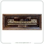 زمینه تابلو با روکش گردو آمریکایی طراحی شده است. گردوی آمریکایی یکی از زیباترین چوبهای تیرهرنگ است که بافت پیچخورده و رنگهای قهوهای شکلاتیاش حس گرمی و اصالت را به تابلو منتقل میکند. این روکش با حروف روشنتر معرقشده تضاد چشمنوازی ایجاد کرده که به وضوح و خوانایی متن کمک میکند و در عین حال جلوهای فاخر و کلاسیک به اثر میدهد.