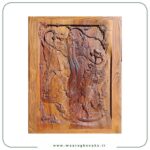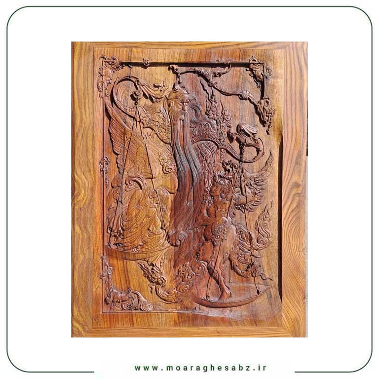 با توجه به ابعاد ۱۰۰ در ۸۰ سانتیمتر و وزن ۱۵ کیلوگرم، این تابلو از چوبی سنگین و متراکم (مانند گردو، راش یا توسکا) ساخته شده و حجم زیادی از آن بهصورت برجسته و سهبعدی منبتکاری شده است. در چنین آثاری، ترازو، پایهها، کفهها و تزئینات اطراف معمولاً با جزئیاتی دقیق، خطوط نرم و منحنیهای متقارن اجرا میشوند که چشم بیننده را جذب و توجه را بر محور مفهوم عدالت متمرکز میکنند.