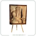 استفاده از چوب گردو بهصورت کامل در این تابلو، نشاندهنده توجه به کیفیت و ارزش هنری بالای اثر است. گردو از مقاومترین و زیباترین چوبهای طبیعی است که دارای بافت پیچخورده، رگههای متنوع قهوهای تیره تا روشن، و ظاهری لوکس است. این چوب به دلیل سختی متوسط، برای منبتکاری بسیار مناسب است؛ هم برشپذیر است و هم در عین حال به خوبی فرم و جزئیات را حفظ میکند. استفاده از چوب گردو به صورت تمامچوب (نه روکش یا ترکیبی) نشاندهنده سطح بالای کار و ماندگاری طولانی تابلو است.